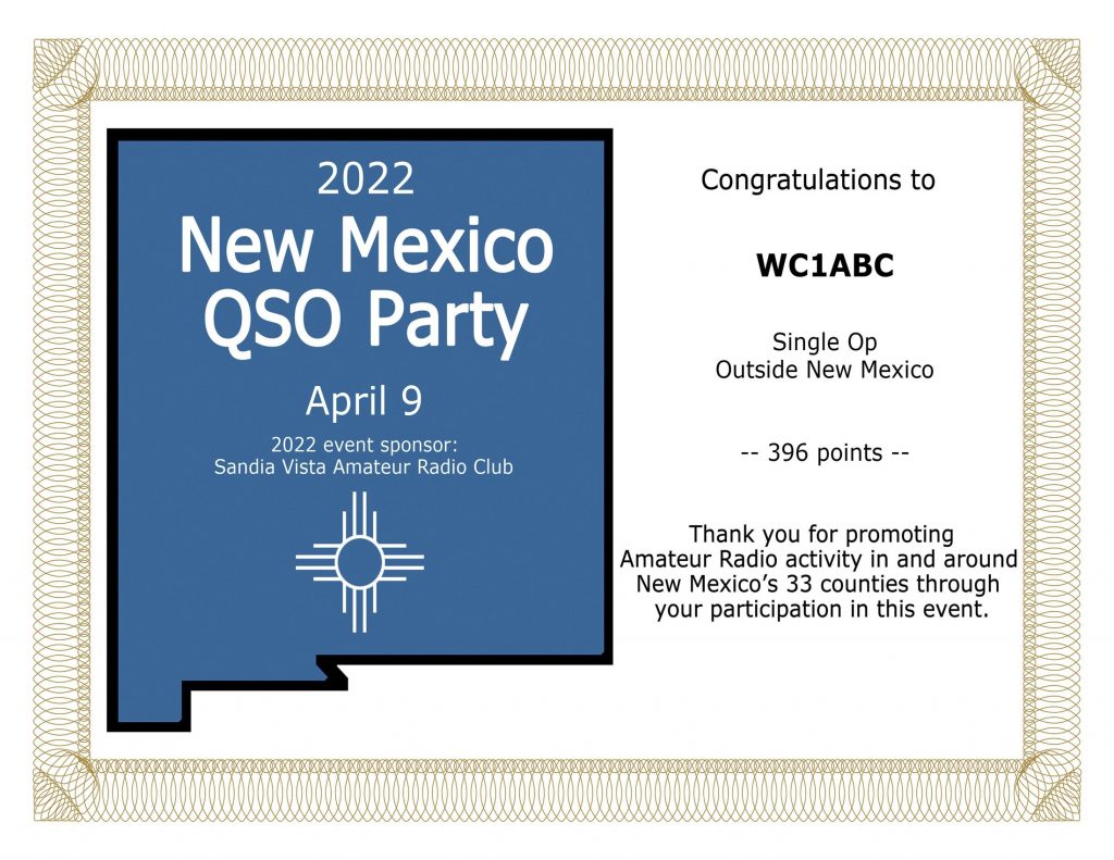 The New Mexico QSO Party provides downloadable participation certificates for all stations that submitted an electronic or paper log. Certificates are available for New Mexico QSO Party events from 2020 to the present.